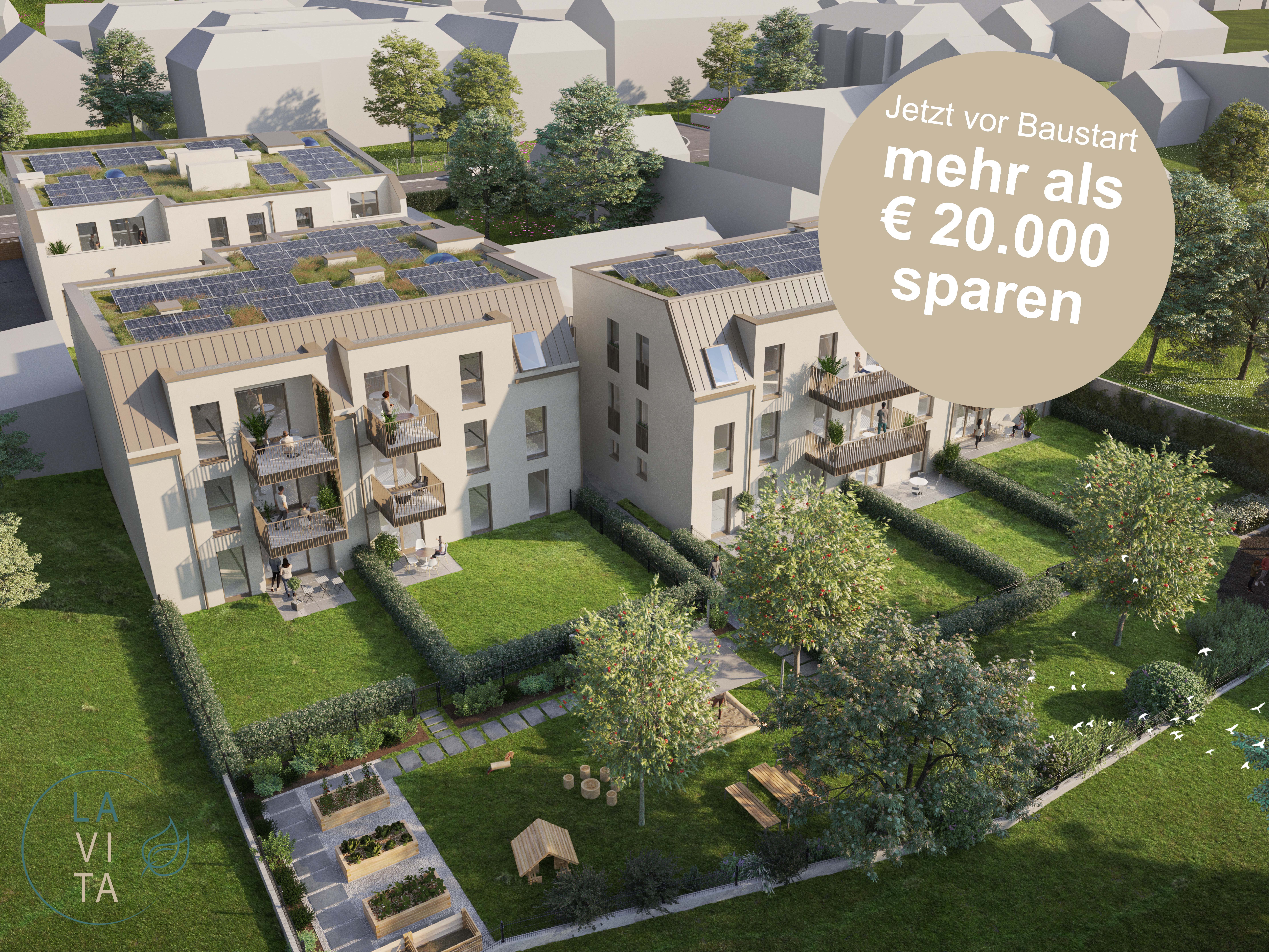 LAVITA steht für hochwertige Wohnraumausstattung (Parkett, Fußbodenheizung mit Flächenkühlung im Sommer, zusätzliche Deckenkühlung in DG-Wohnungen) und private Wohlfühloasen in Form von Balkonen, Terrassen oder Gärten. Begegnungsräume für eine gelebte Nachbarschaft befinden sich im Allgemeingarten. Gemeinschaftsbeete, Sitzgelegenheiten und Spielgeräte laden zum Austausch und Verweilen ein. Die hauseigene Tiefgarage bietet die Möglichkeit für E-Ladestationen.