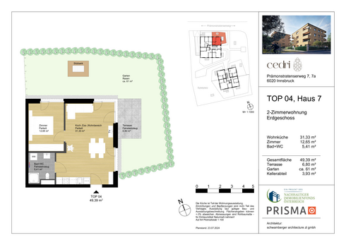 Willkommen in dieser bezaubernden 2-Zimmer-Neubauwohnung im Erdgeschoss am Prämonstratenserweg 7 in Innsbruck! Mit einer Wohnfläche von 49,39 m² bietet diese Wohnung ein durchdachtes Raumkonzept und ist ideal für Singles oder Paare. Der großzügige 61 m² Garten lädt zum Entspannen und Verweilen ein, während der 6,8 m² Balkon perfekte Möglichkeiten für gemütliche Stunden im Freien bietet. Die ruhige Lage kombiniert naturnahes Wohnen mit der Nähe zur Stadt, was diese Wohnung zu einem idealen Rückzugsort macht.