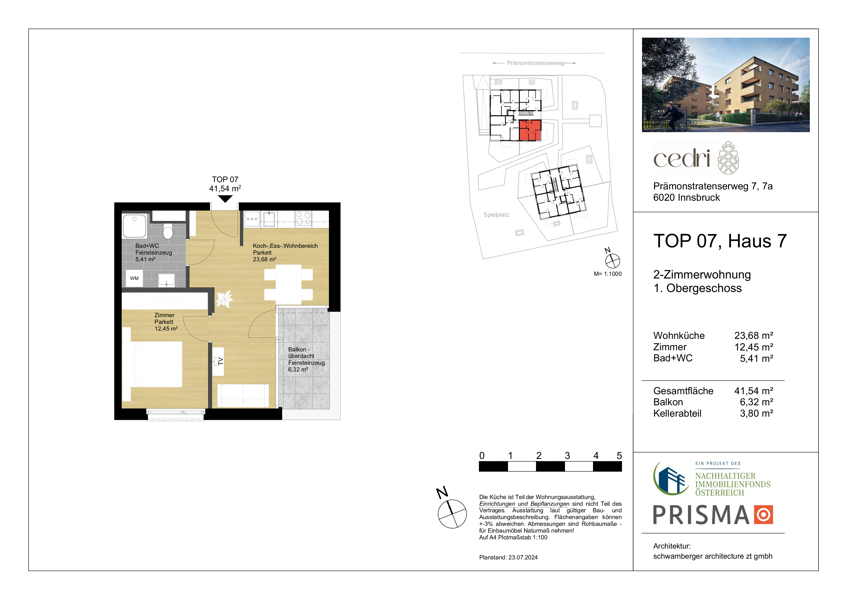Willkommen in dieser gemütlichen 2-Zimmer-Neubauwohnung im 1. Obergeschoss am Prämonstratenserweg 7 in Innsbruck! Mit einer Wohnfläche von 41,54 m² ist diese Wohnung ideal für Singles oder Paare. Der 6,32 m² große Balkon bietet einen charmanten Rückzugsort im Freien. Die ruhige Lage kombiniert die Vorzüge naturnahen Wohnens mit der Nähe zur Stadt und schafft ein angenehmes Wohnumfeld, das zum Entspannen einlädt.