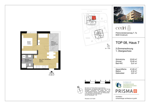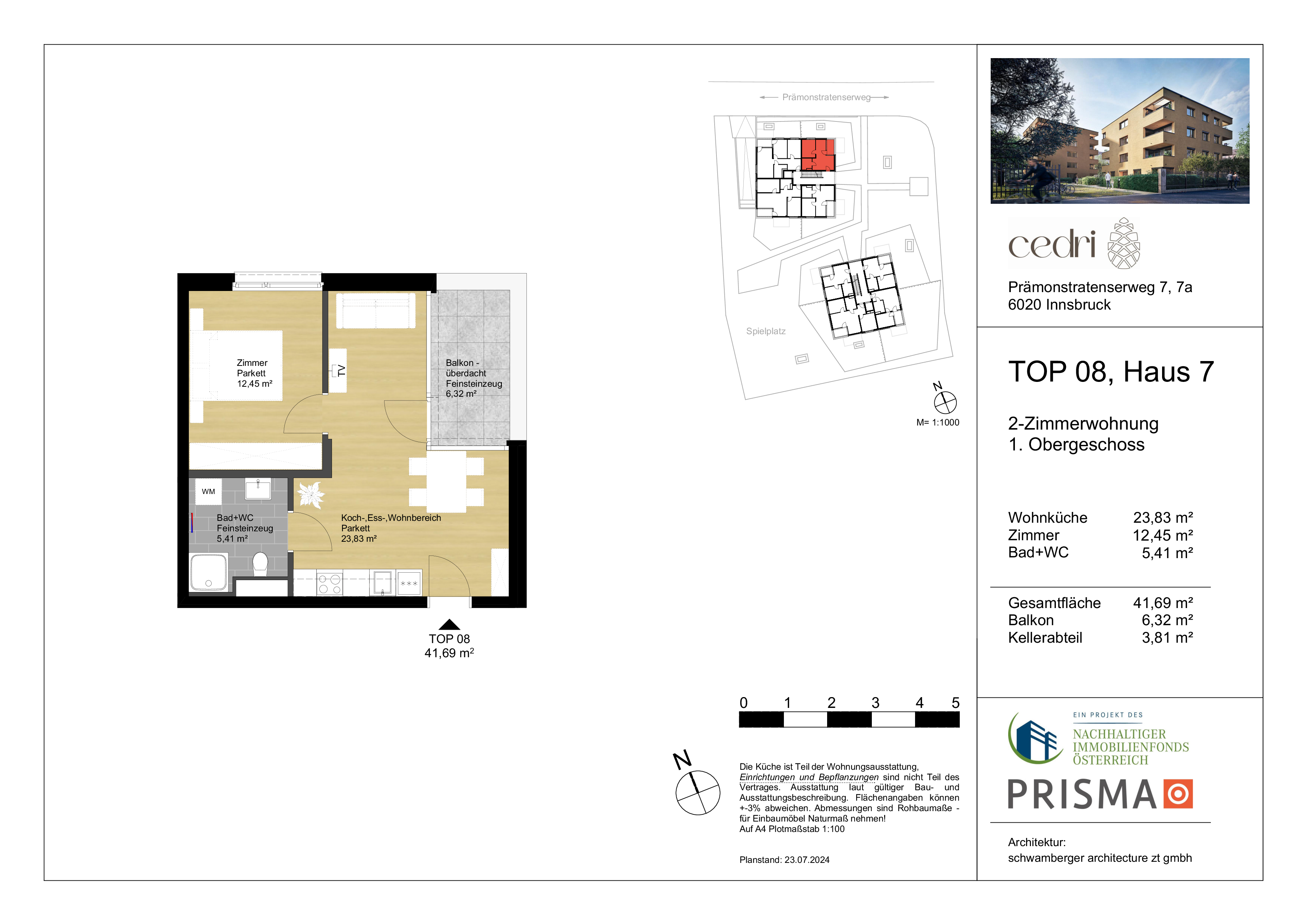 Entfliehen Sie dem Alltagsstress in dieser charmanten 2-Zimmer-Neubauwohnung im 1. Obergeschoss am Prämonstratenserweg 7 in Innsbruck. Mit einer cleveren Raumaufteilung auf 41,69 m² bietet diese Wohnung sowohl Gemütlichkeit als auch modernen Komfort. Der einladende 6,32 m² große Balkon wird zum perfekten Rückzugsort, um die Natur zu genießen oder den Sonnenuntergang zu beobachten. Ideal für trendbewusste Stadtliebhaber, vereint diese Wohnung stilvolles Wohnen mit der Nähe zur pulsierenden Innenstadt und den ruhigen Grünflächen der Umgebung.
