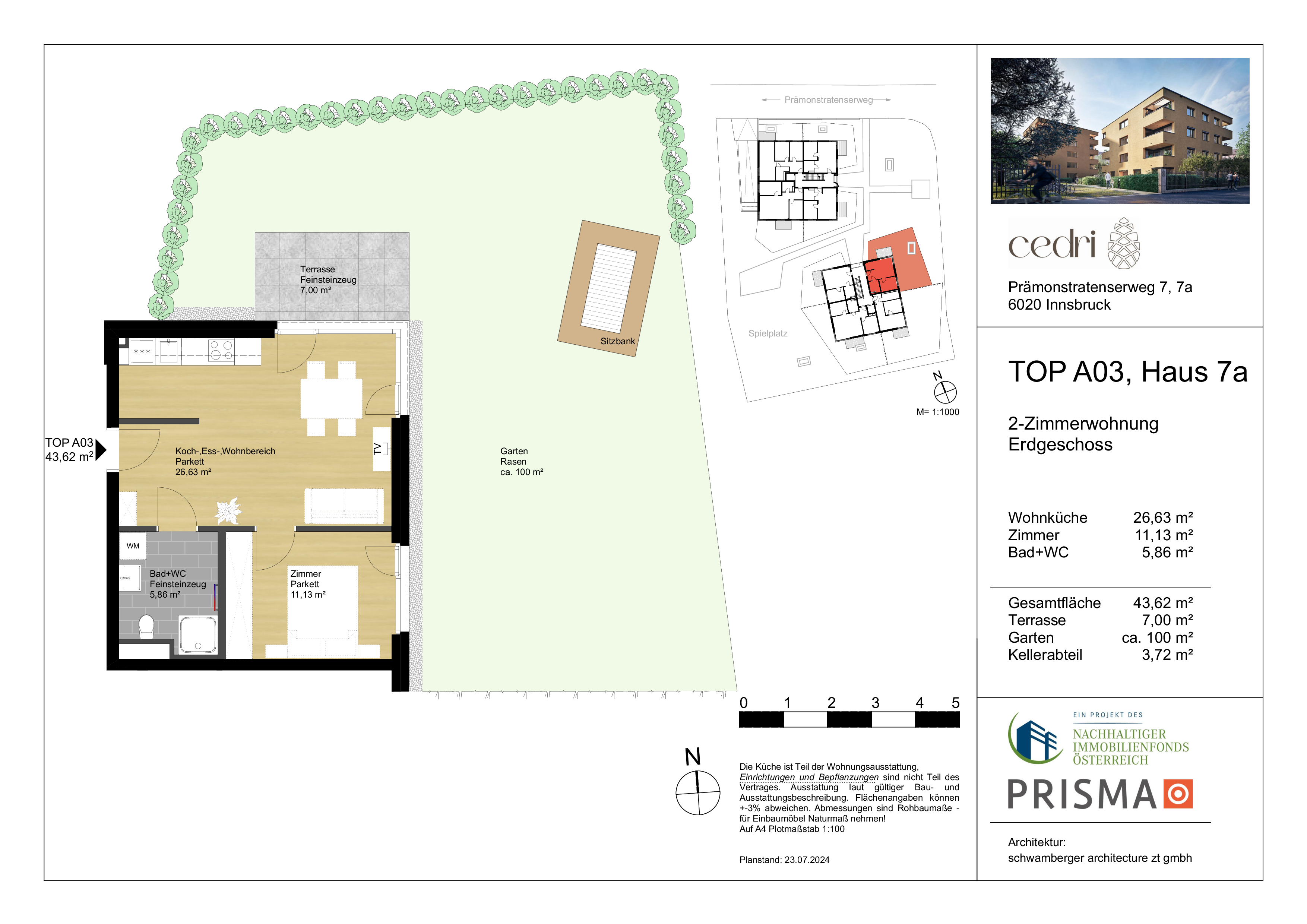 Willkommen in dieser charmanten 2-Zimmer-Neubauwohnung im Erdgeschoss am Prämonstratenserweg 7a in Innsbruck! Mit einer Wohnfläche von 43,62 m² bietet diese Wohnung eine durchdachte Raumaufteilung, die für modernen Komfort sorgt. Der großzügige 100 m² Garten ist ideal für entspannte Stunden im Freien, während der 7 m² große Balkon zusätzlichen Platz zum Verweilen bietet. Genießen Sie die ruhige Lage, die Ihnen gleichzeitig den Zugang zu den urbanen Annehmlichkeiten der Stadt ermöglicht – Ihr neues Zuhause erwartet Sie!