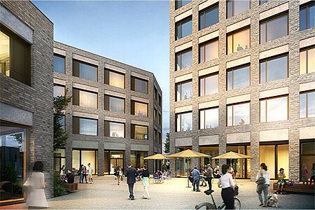 Das mit einer Gesamtfläche von ca. 4.900 m² große Gebäudeensemble, besteht aus drei Einzelgebäuden und definiert mit seiner städtebaulichen Komposition einen neuen Stadtraum. Die Öffnung des Glanbachs schafft eine naturnahe Aufenthaltszone am Wasser und die mit Gastronomie belebten Erdgeschosszonen einen lebendigen Treffpunkt.
