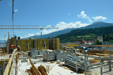 Das sechste und letzte Stockwerk ist am Entstehen und man kann schon jetzt den traumhaften Ausblick in Richtung Innsbrucker Hausberg, den Patscherkofel, genießen. Alle Wohnungen werden mit großen Fenstern ausgestattet, die für ein helles und freundliches Raumklima sorgen werden.
