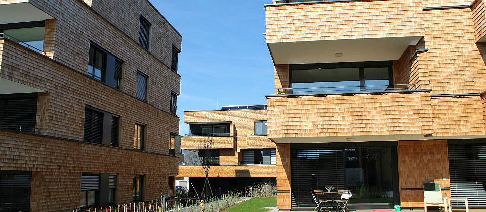 Drei Häuser sind Fritz am See in Bregenz. Sie bilden einen gemeinsamen, zentralen Hofraum, um sich wohlzufühlen, zu vernetzen und ein „laissez-faire“ zu genießen.