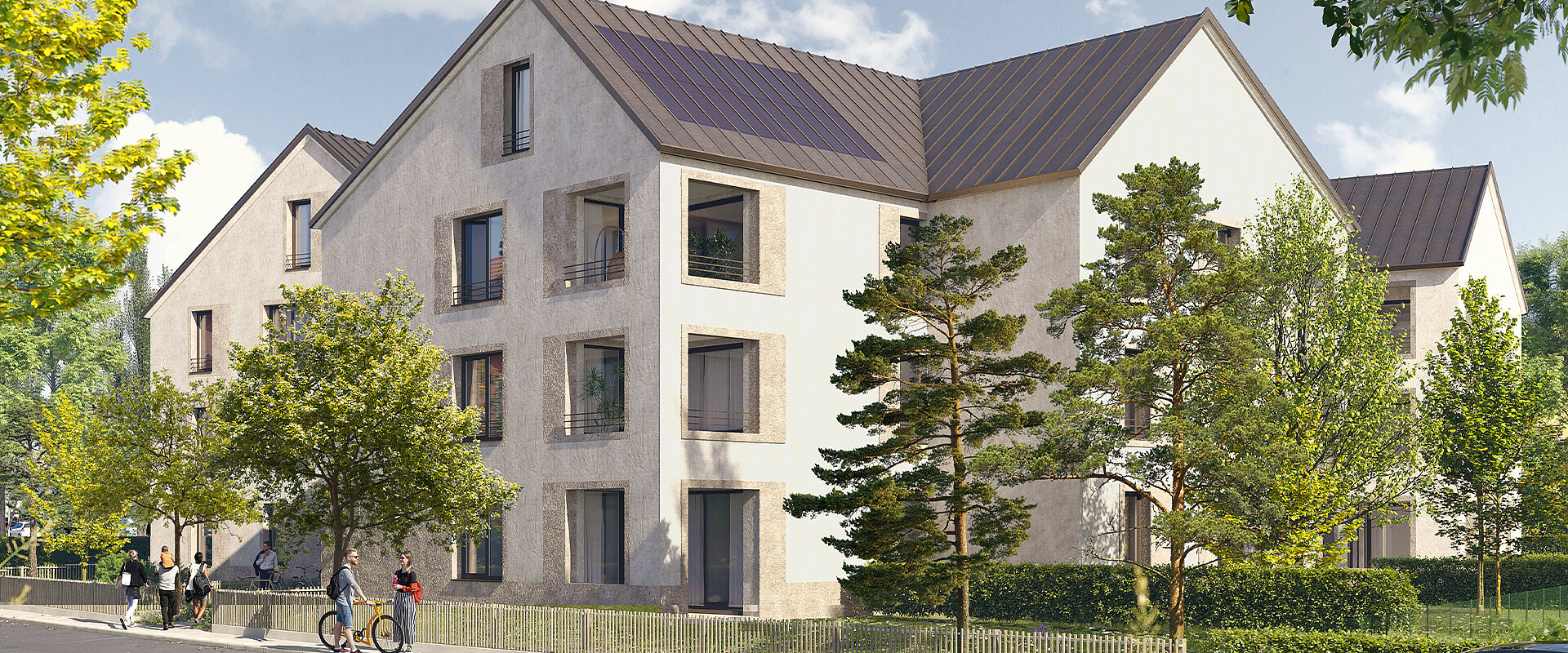 Massive Außenwände, Decken und die Dachkonstruktion aus Stahlbeton bilden das statisch konstruktive Grundgerüst der Häuser und sorgen aufgrund ihrer hohen Speichermasse ganzjährig für ein ausgewogenes und behagliches Innenraumklima. Dem Verputz der mineralisch gedämmten Außenwände kommt bei der Gestaltung der Baukörper eine wesentliche Bedeutung zu. In hellen Erdtönen und differenzierter Putzstruktur werden die Sockelbereiche und Fensterumrahmungen in einem geschliffenen Glattputz gehalten. Die restlichen Wandflächen werden in einem fein strukturiertem Deckputz ausgeführt. Tiefgezogene Fensterparapete (ca. 60 cm) sorgen für eine gute Belichtung und schöne Außenraumbezüge. Die markanten Steildächer sind mit einer Stehfalz-Blecheindeckung ausgeführt.