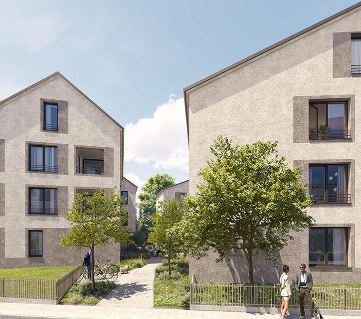 Drei Häuser sind Fritz am See. Sie bilden einen gemeinsamen, zentralen Hofraum, um sich wohlzufühlen, zu vernetzen und ein „laissez-faire“ zu genießen. Die Gebäude knüpfen mit ihren Dachformen an die Häuser in der Nachbarschaft an. Eine E-Ladestation sowie eine Photovoltaik-Anlage ergänzen einen nachhaltigen Standard. Die klare und präzise Setzung schafft Identität. Das Ensemble reagiert mit zwei Vollgeschossen und einem Dachgeschoss auf die umgebende Bebauung in der Fritzstraße und gliedert sich harmonisch in das Quartier ein. Eine gemeinsame Tiefgarage bietet Platz für 22 Pkw-Stellplätze.